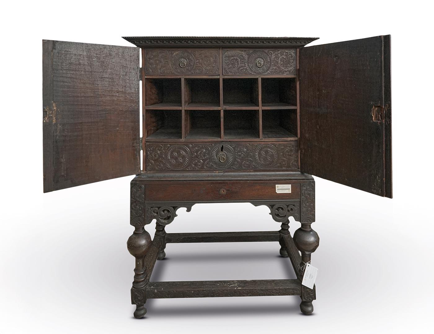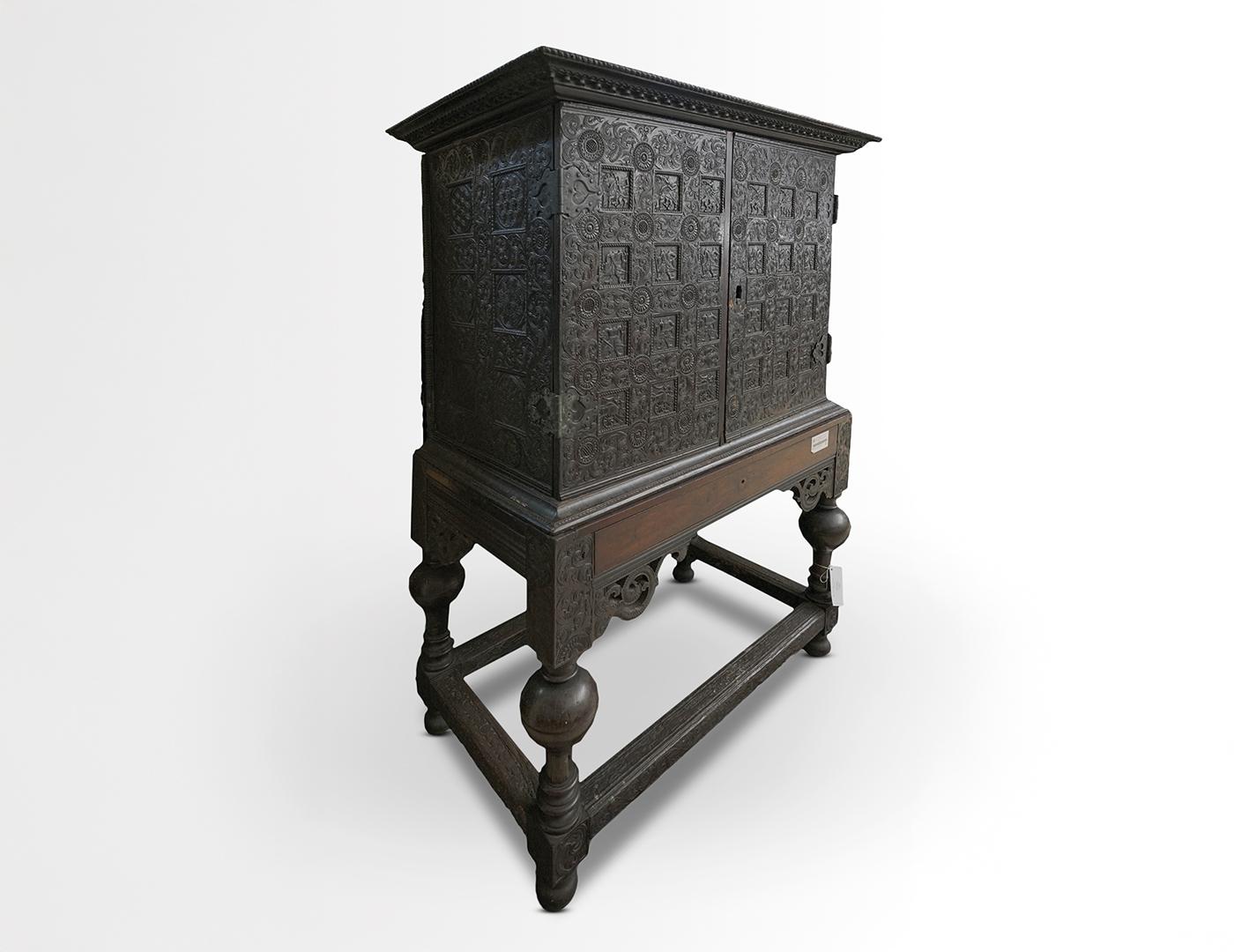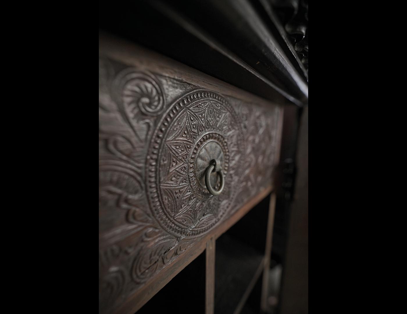 Kabinet yang sangat langka ini terbuat dari kayu cendana merah dan menampilkan ukiran rumit yang menggambarkan prajurit yang membawa tombak, senapan, dan meriam.