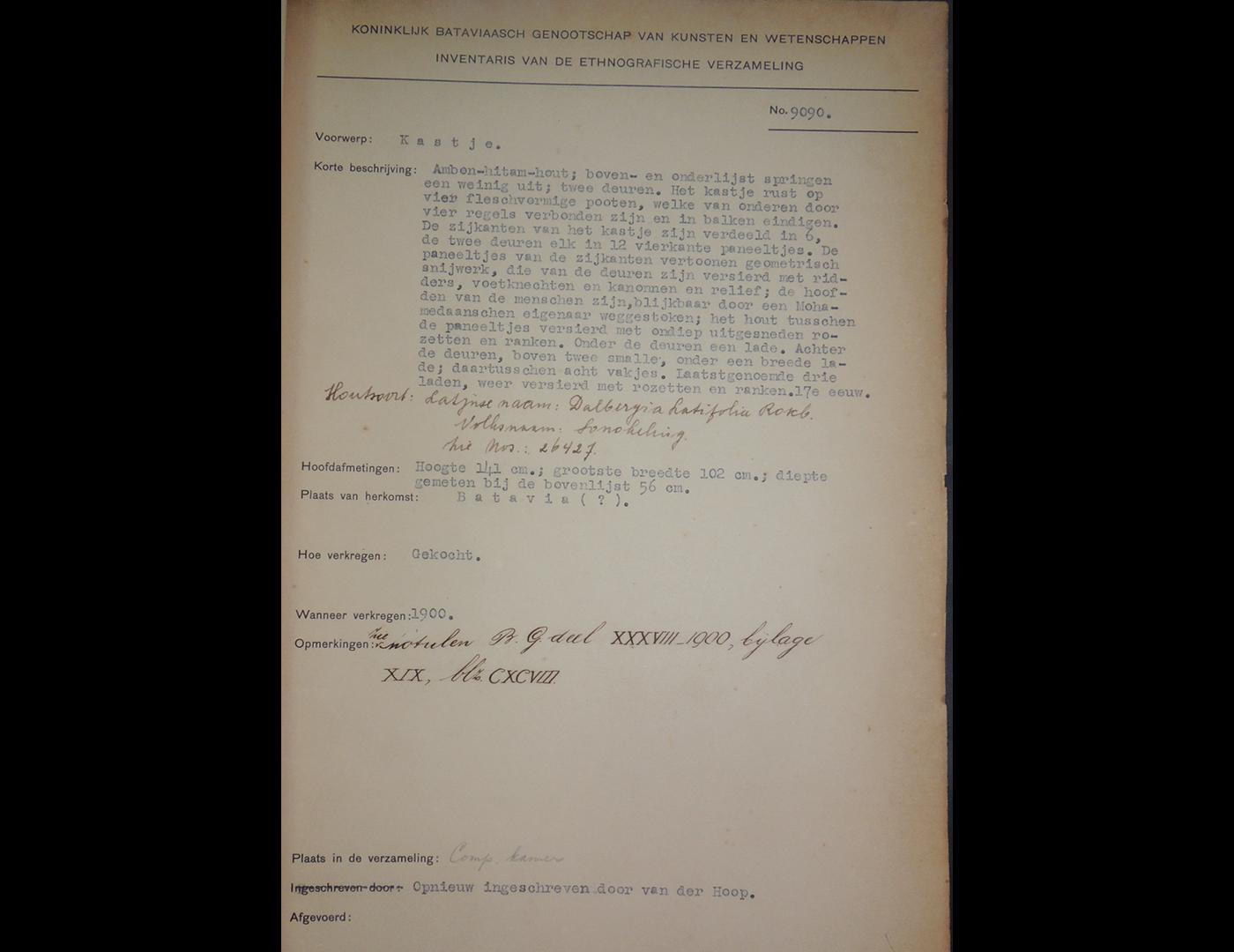 Dibeli oleh Ikatan Kesenian dan Ilmu Batavia (Bataviaasch Genootschap van Kunsten en Wetenschappen) (pada tahun 1900, kabinet ini dipajang di Ruang VOC (1907), dan dalam pameran pemerintah kolonial Belanda yang memperingati tiga ratus tahun Batavia (1919).